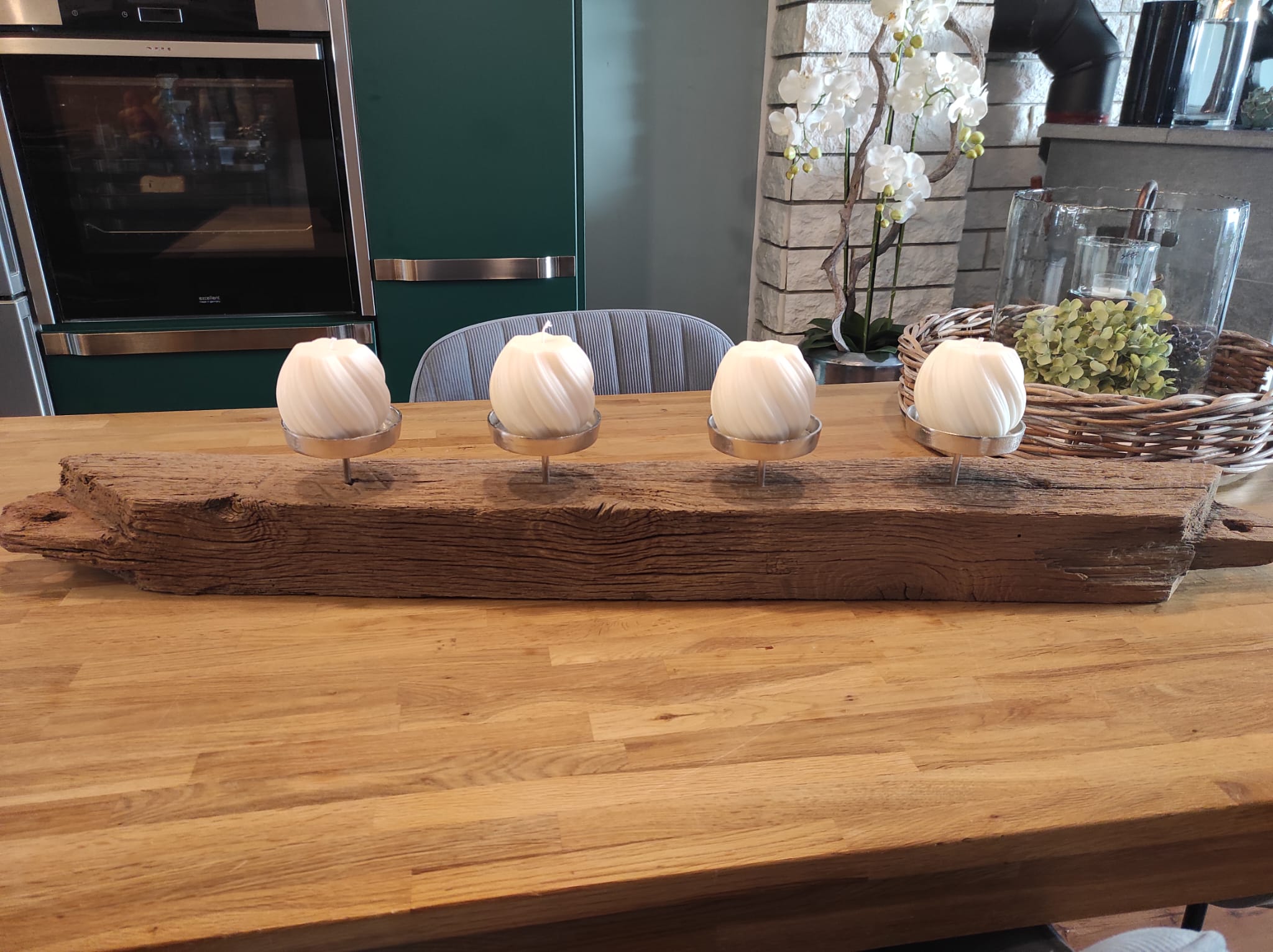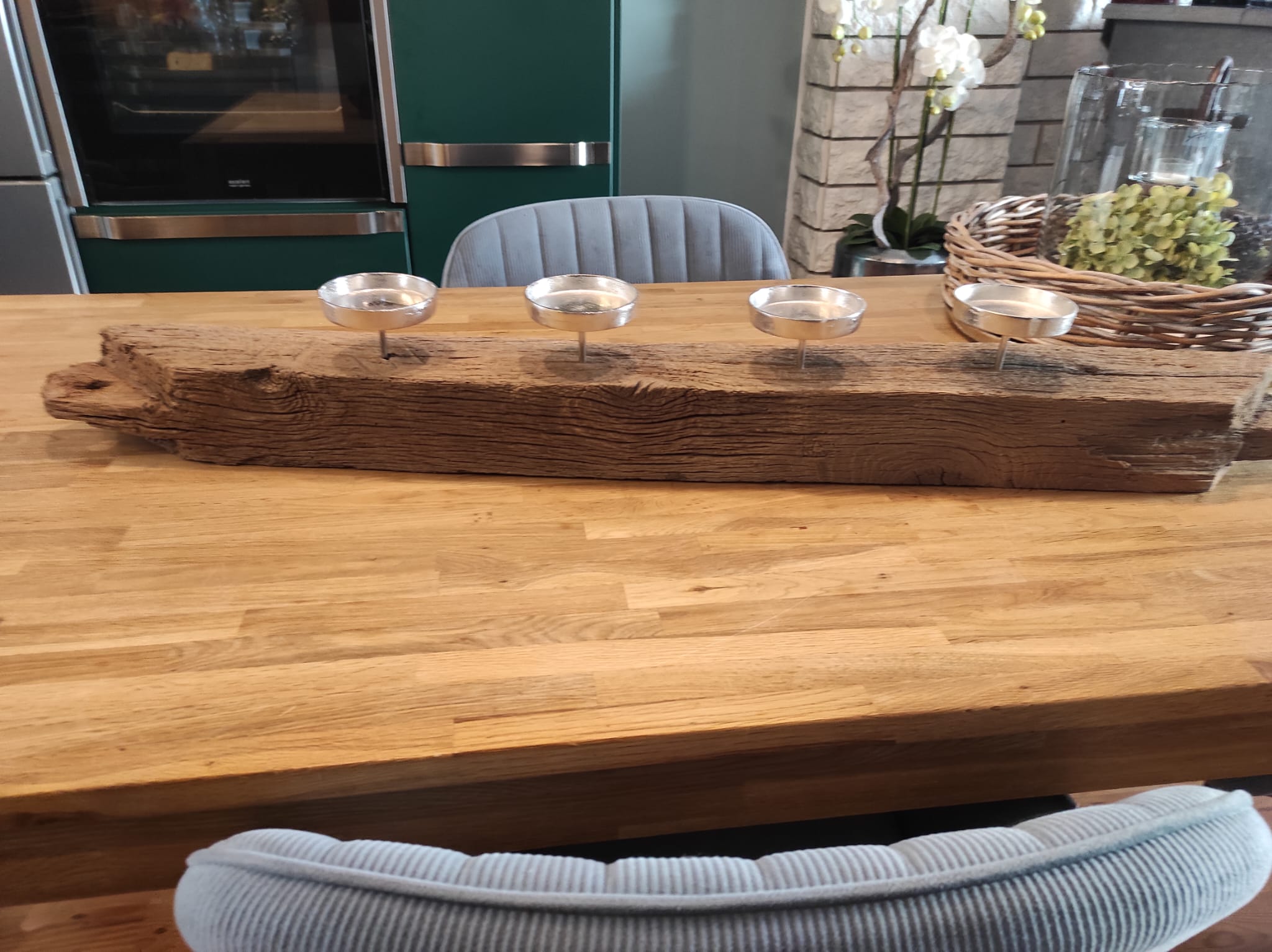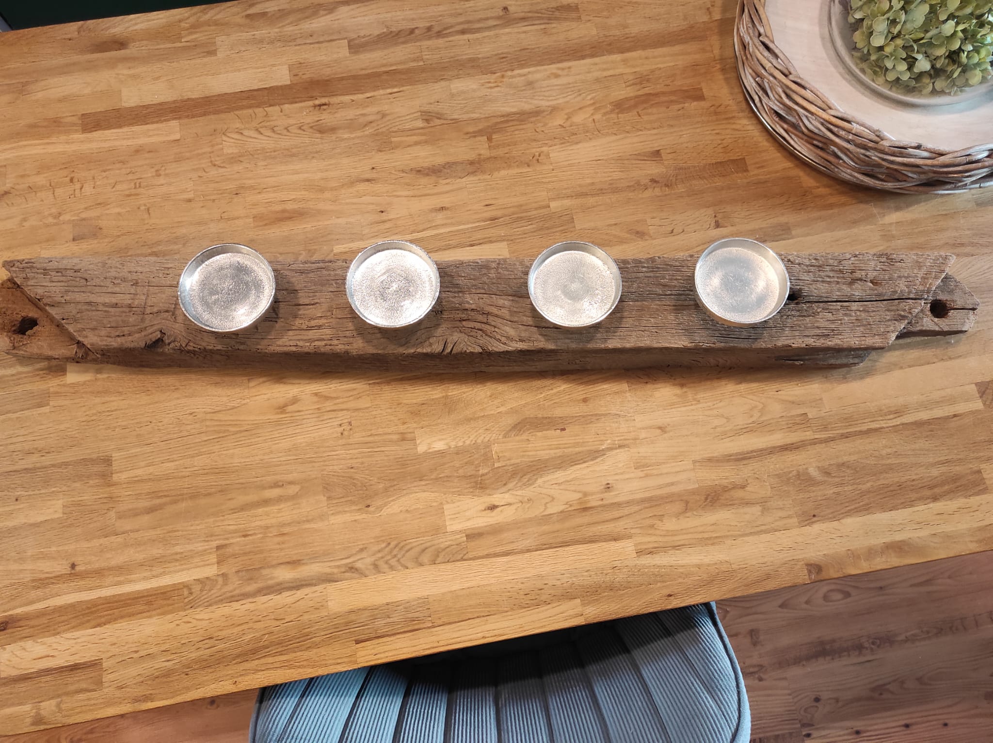 Dieser wunderschöne alter Balken aus einem Fachwerkdachstuhl mit 4 Kerzenteller aus Aluguß ist das Hyglight Deines zu Hause.